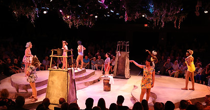 South Pacific's scenic design was a new full build. My focuses were on creating a digital build plan of the designers hand drafting and leading the application and shaping of the platform facing and the creation and rigging of the hanging greenery and foliage patches.